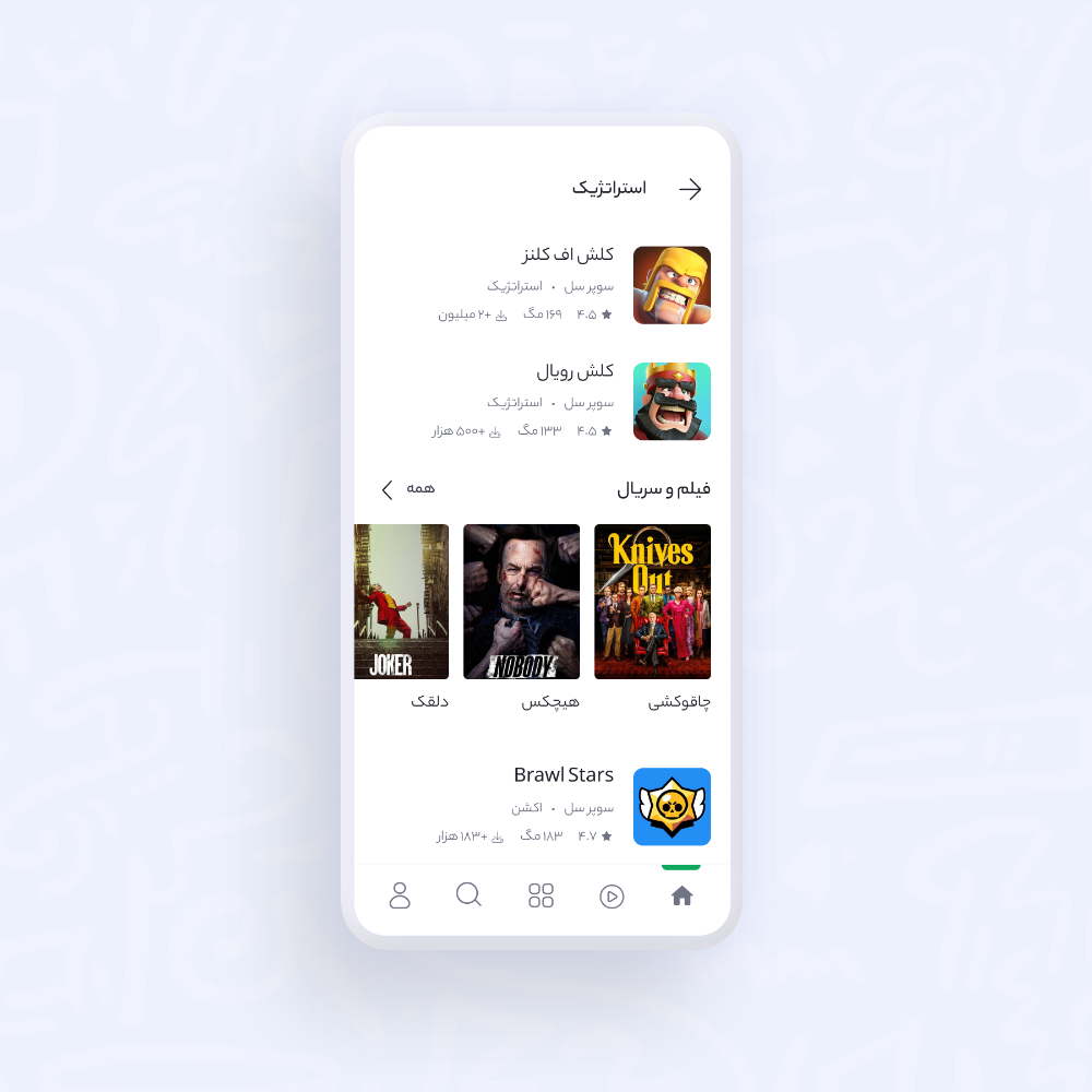 در طراحی قبلی، راه رسیدن به جستوجو از bottom navigation و در کنار گزینههای برنامه، بازی و ویدیو بود. برای بهبود مشکلات بالا، کانالهای جستوجوی محتوا را از هم تفکیک کردیم تا برای کاربر مشخص باشد که در کدام فضای محتوایی جستوجو میکند.